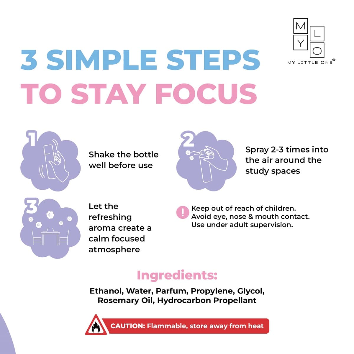 2. Spray 2-3 times into the air around the study spaces 5mins before study time